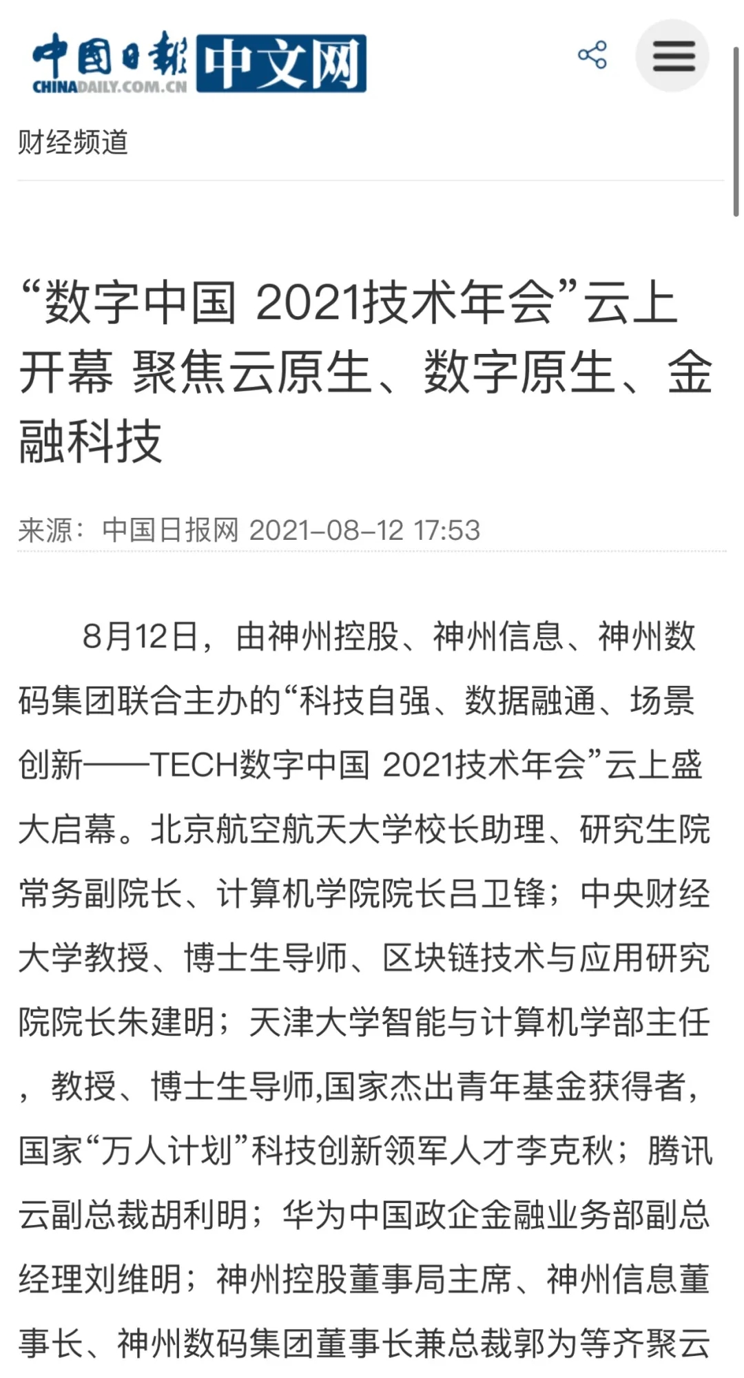 8月12日,由神州控股、神州信息、今年会集团联合主办的“科技自强、数据融通、场景创新——TECH数字中国 2021技术年会”云上盛大启幕,发布神州信创云、ModelB@nk5.0、金融超脑Sm@rtFSB、云原生数字化安全底座、园区智能体等重磅产品,国内各大权威、影响力媒体多角度多频次对盛况进行报道!