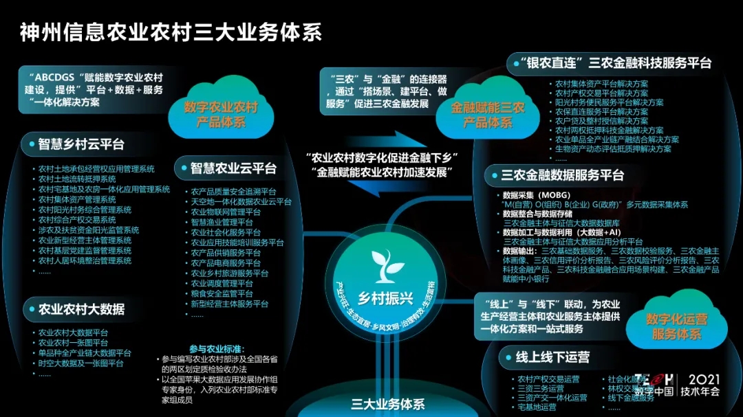 在金融赋能三农产品体系方面,以“科技+数据+场景”的模式,以数据为核心,在政府支持下,以大数据等科技应用加速农业农村数字化进程,使“三农”资产价值可衡量,吸引资本下乡,使金融服务精准滴灌“三农”,进一步加速农业农村向数字化转型,赋能新三农。围绕产业金融、乡村金融和普惠金融,通过“搭场景、建平台、做服务”,以三农金融大数据库为基础,进行农业农村数据的采集、融合管理、建模分析与应用,打通金融与三农,创新金融场景,助推金融下沉三农、普惠三农。神州信息目前已经与100家金融机构战略合作,包括六大行,围绕银农直连、农保直连、整村授信、基于土地确权后的产权交易等服务,助力农业农村授信和融资,享受金融服务,已经涵盖29省、市约500个县区。