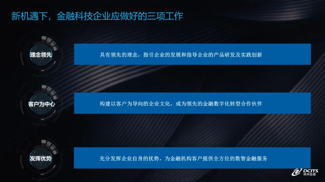 产业数字化为我们的金融服务打开了新的蓝海,但是能否在新蓝海中抢占先机,需要银行充分结合自身的优势、特点和能力。而我们神州信息作为一家金融科技企业,面对数智金融的发展,我们能不能抓住这个新机遇?我认为只要我们能做好三方面的工作,答案就是肯定的。